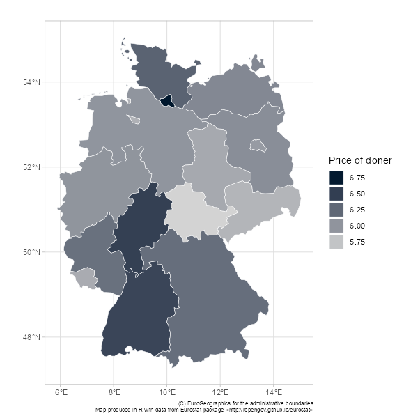 The winners of the döner lottery are the citizens of the state Thüringen. They get their döner at the low-low price of €5.7. Again, that not all that surprising given the socioeconomic parameters (and I will get better into all of that later).