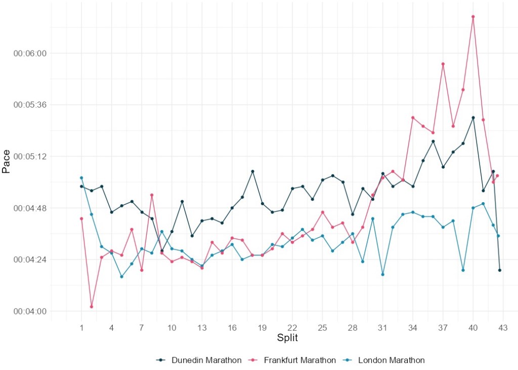 The graph above shows the average tempo per km broken down by race. It only contains three races, my first race I do not have data for and Boston was just too bad to include. I just looks like a COVID-19 dashboard-chart from 2020.