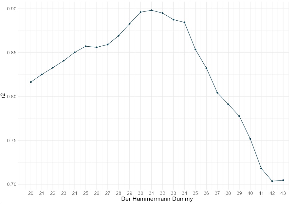 For each model run I (lazily) looked at the R2 and used that to find at what split I could best predict the outcome each of the three races. For you nerds out there, here is a chart showing the R2 statistic (goodness of fit) depending on where I place the dummy. And it looks like Der Hammermann arrives, in my case, around the time I have 10 km left to run.