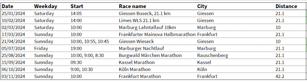 Next year will be my half-marathon year. I will make two attempts to get my 10 km time closer to my PB. I doubt I will make it under 39 minutes, but who knows. But, I am determined to finally break my half-marathon PB. I suspect that to happen either in Frankfurt in March or in Marburg in July. Depending on how I am looking after Köln, I might go for my PB in Frankfurt.