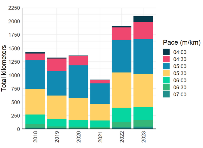 Let’s start with a chart. The chart below shows every single km I have run and registered since 2018. The colors distinguish how many kms I ran at a certain pace. Dark blue are all the kms I ran under 4 min/km pace, pink are kms I ran between 4:00 and 4:30, etc.
