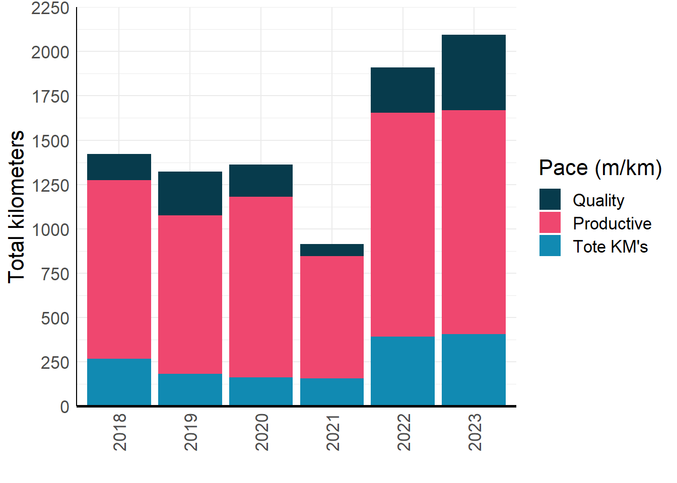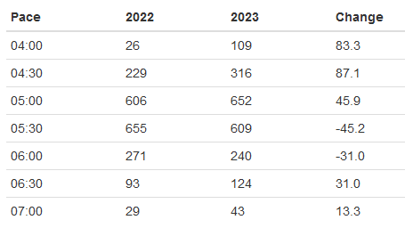 Let’s dig deeper and look at the numbers behind the charts. The table below compares 2022 to 2023 for each pace category. And it is remarkable to see the added quality kms. This year I ran 316 kms under 4:30 pace, that is 170 kms more than I did last year!