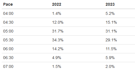 And the table shows the share of kms ran split by pace and is indeed encouraging, and suggests that in 2023 I did allocate my scarce training time efficiently. For example first row, and most important one, tells me that 1.4% of my running I ran under 4:00 pace in 2022 and 5.2% in 2023.
